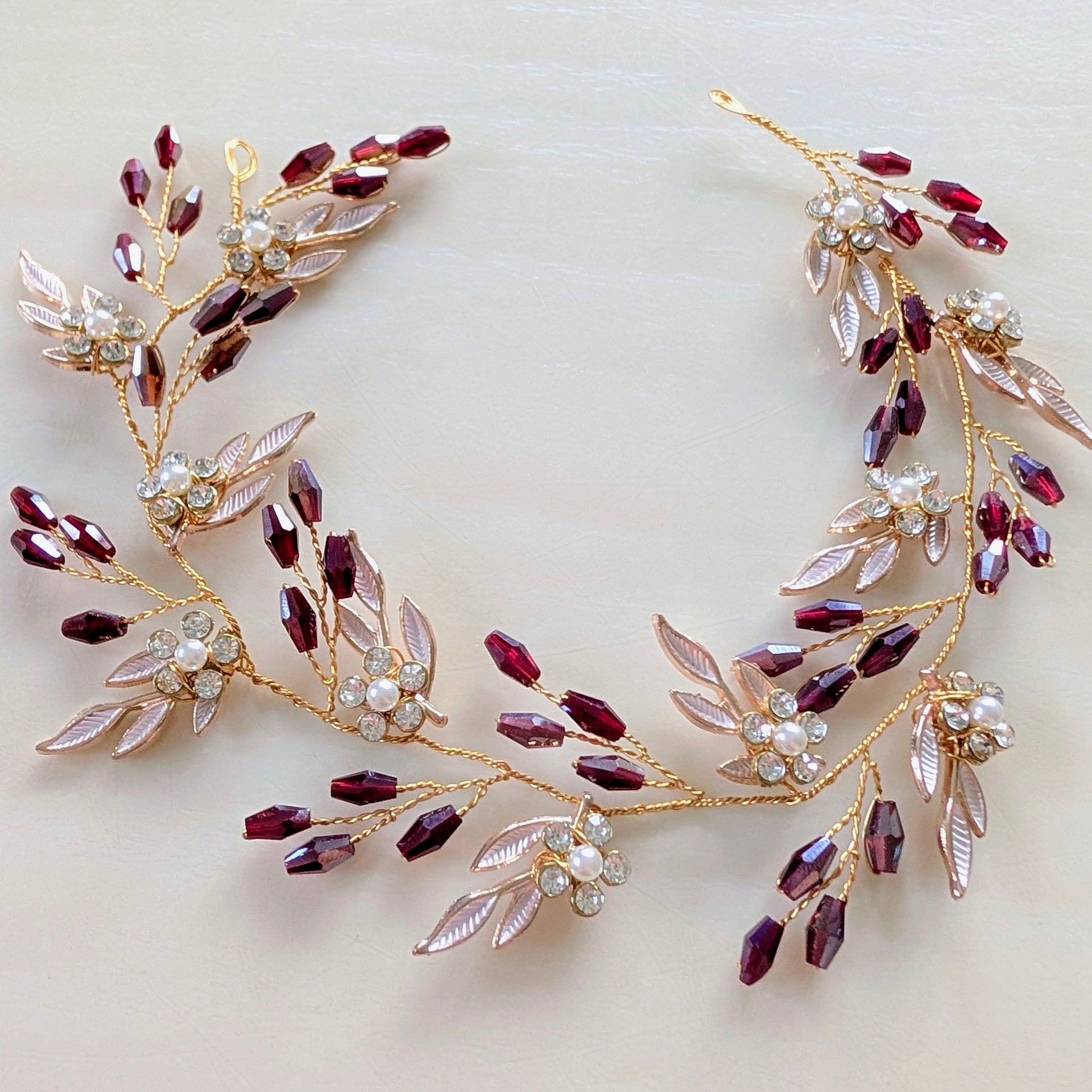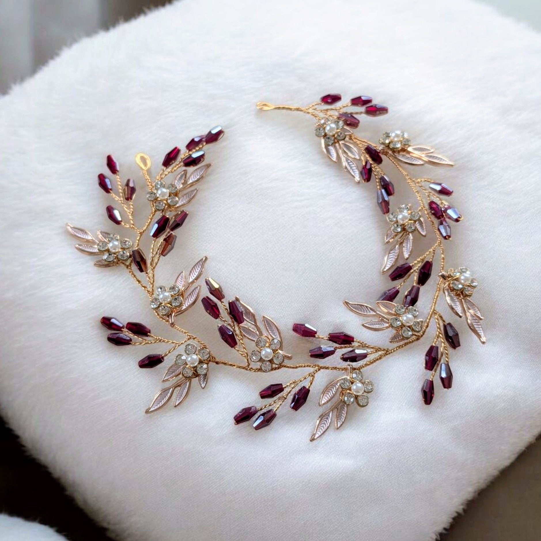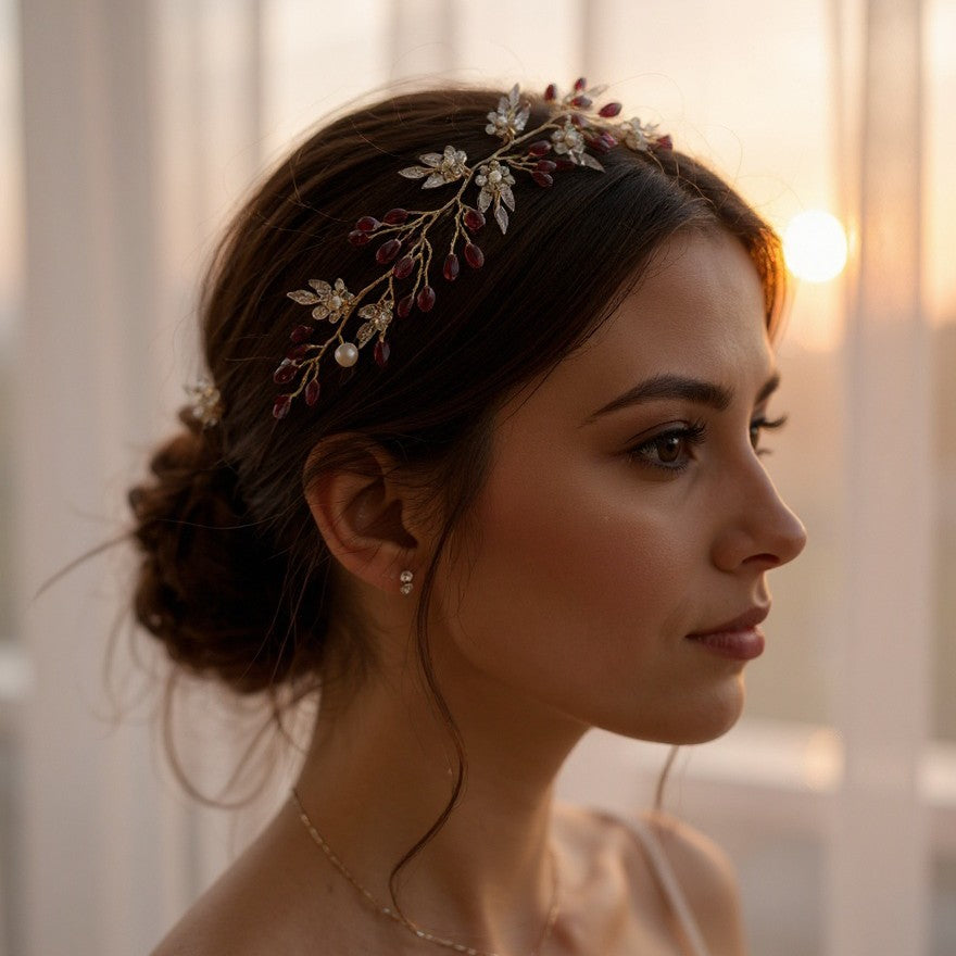 Elevate your winter wedding or festive season look with our Gold Leaf Hair Vine adorned with sparkling Burgundy Crystals. Handcrafted with precision, this delicate hair accessory features intricately designed gold-tone leaves intertwined with deep burgundy crystals that shimmer beautifully in candlelight or seasonal lighting.