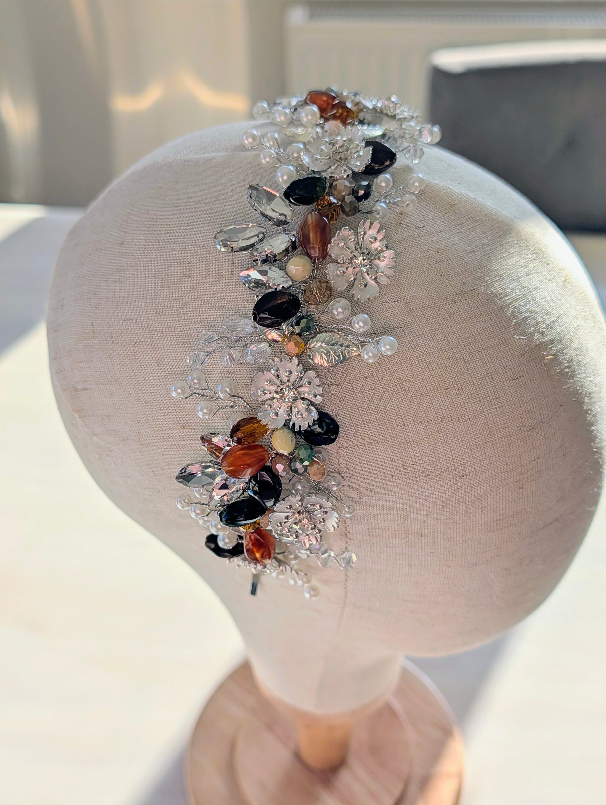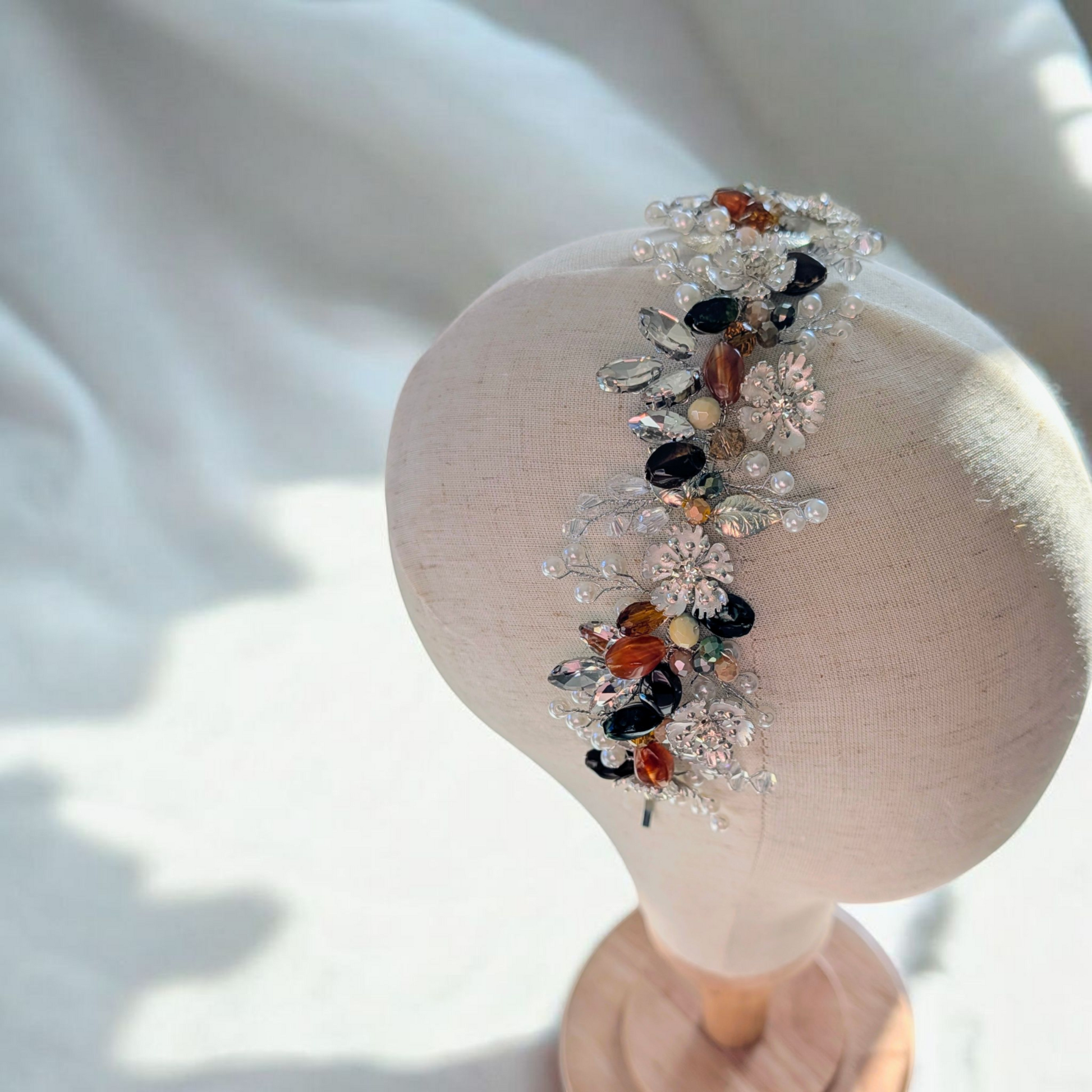 Find warmth and serenity in the Golden Solace Crown, a handcrafted headpiece from our Gilded Garden Collection. This radiant design weaves together golden florals, amber and pearl accents, and silver leaves, capturing the soft glow of sunlight through autumn branches.