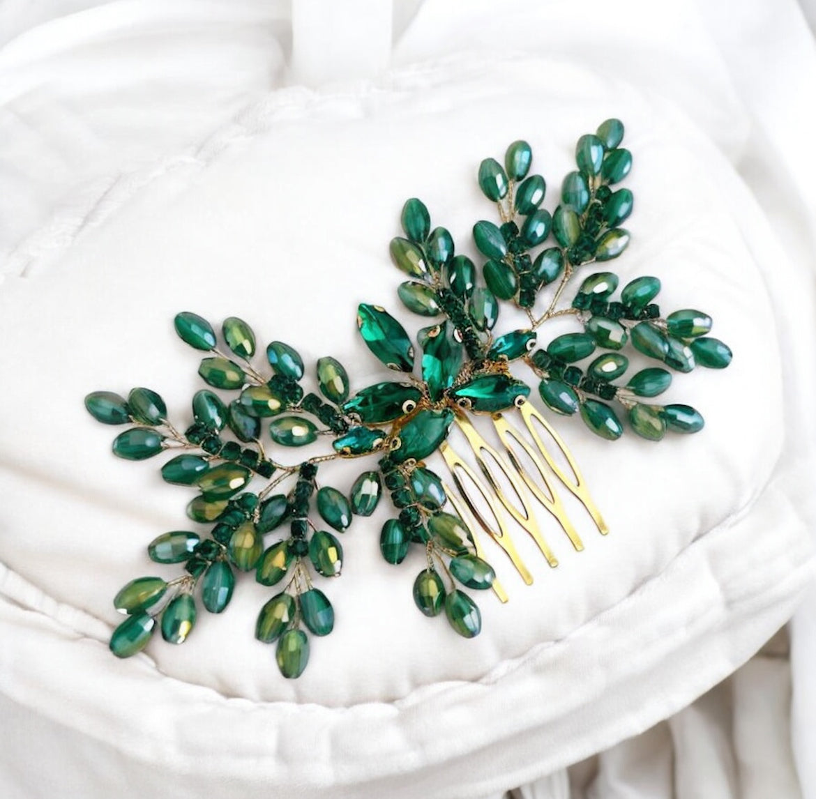 A stunning emerald green bridal and occasion hair comb with beautiful faceted crystals.