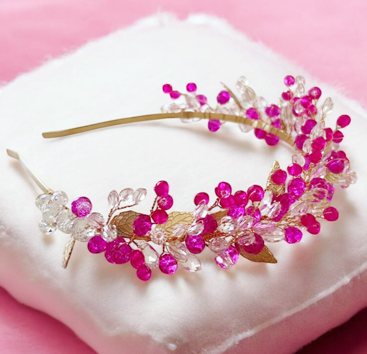 Add a pop of color and timeless elegance to your look with our Bright Pink Crystal Headband, delicately adorned with shimmering crystals and gold leaf accents. Perfect for weddings, proms, festivals, and special occasions, this handmade headband combines bold femininity with a touch of nature-inspired luxury.