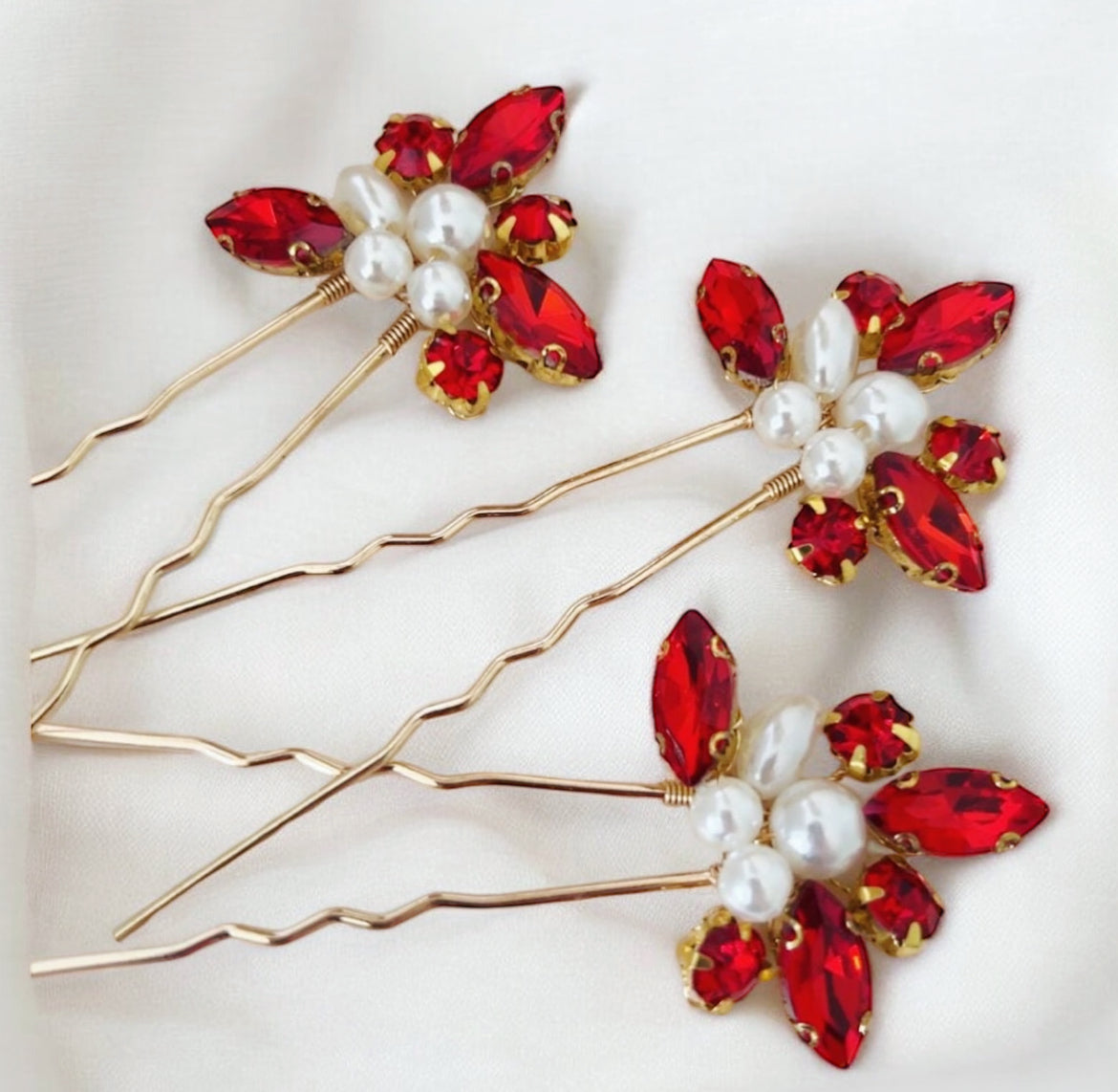 Add a touch of elegance and sparkle to your hairstyle with our Red Crystal and Pearl Hair Pins. This set of three handcrafted pins features radiant red crystals paired with luminous pearls, creating the perfect blend of bold and classic style.